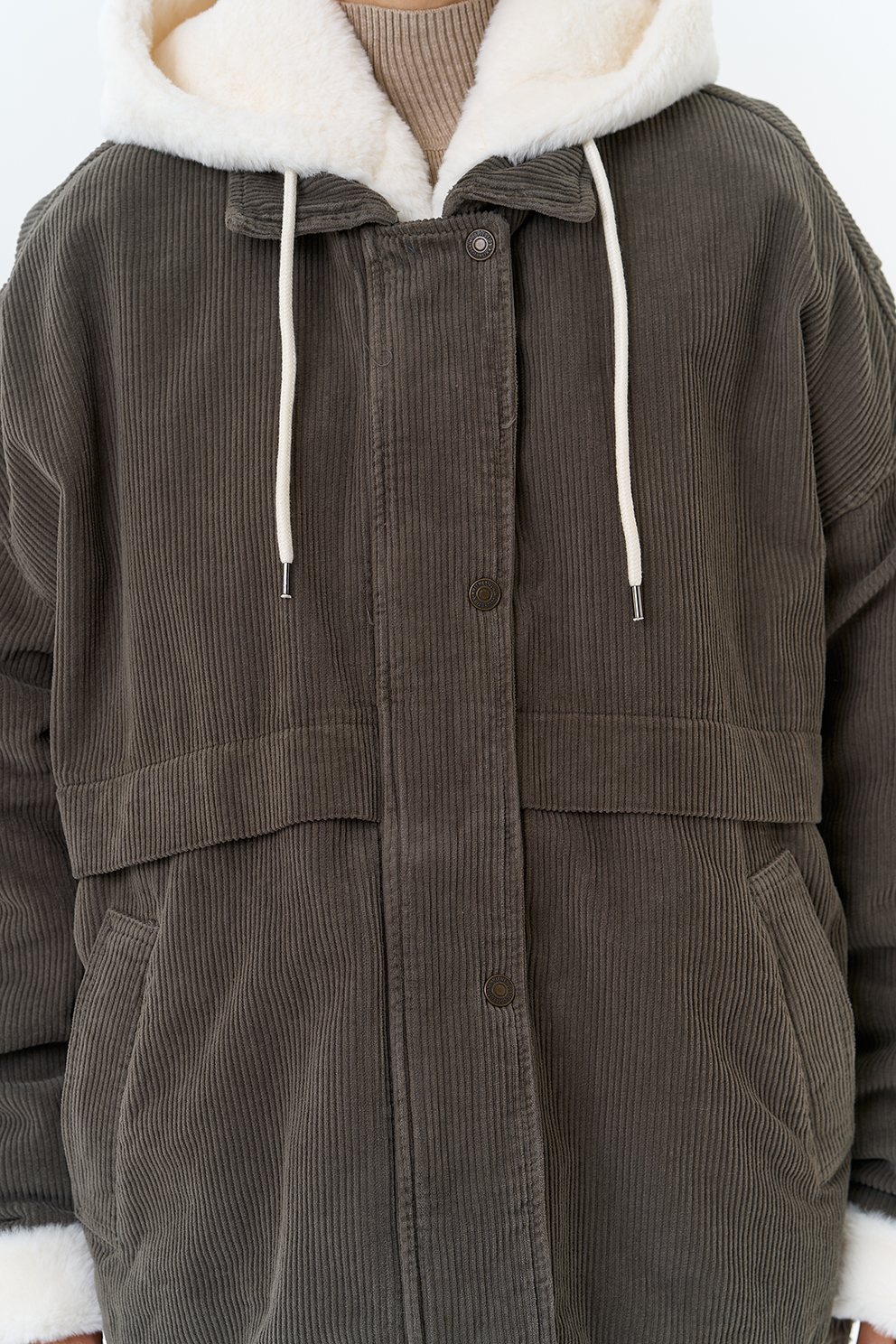 Крой воротника - съемный капюшон, отделка эко мех