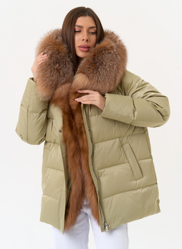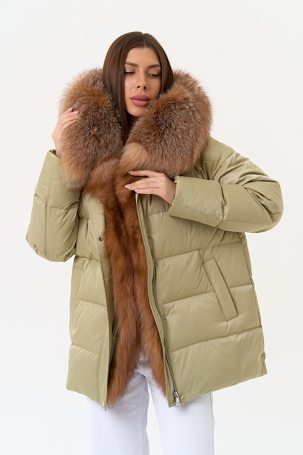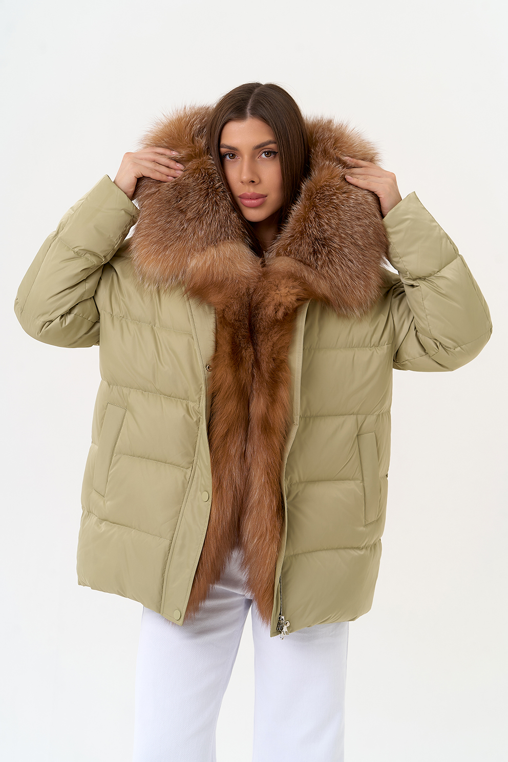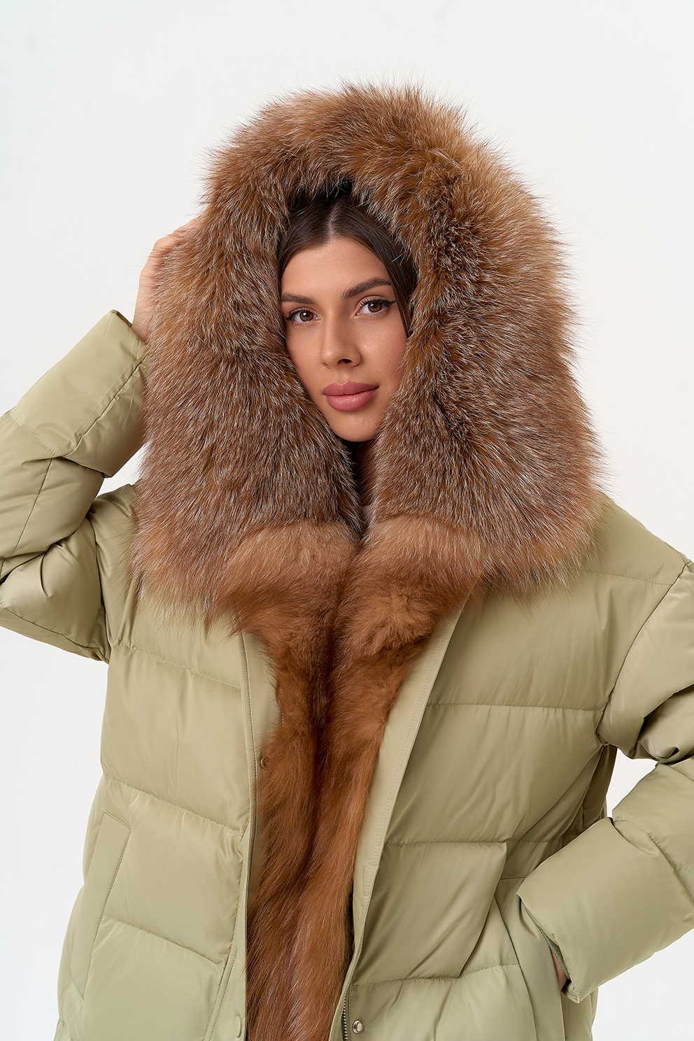 Крой воротника - капюшон, отделка мех рыжей лисы