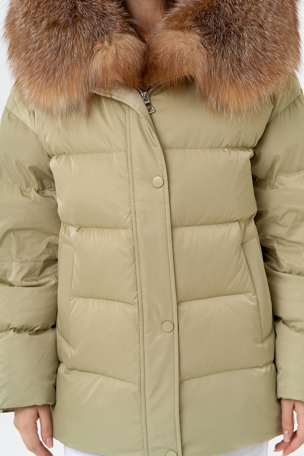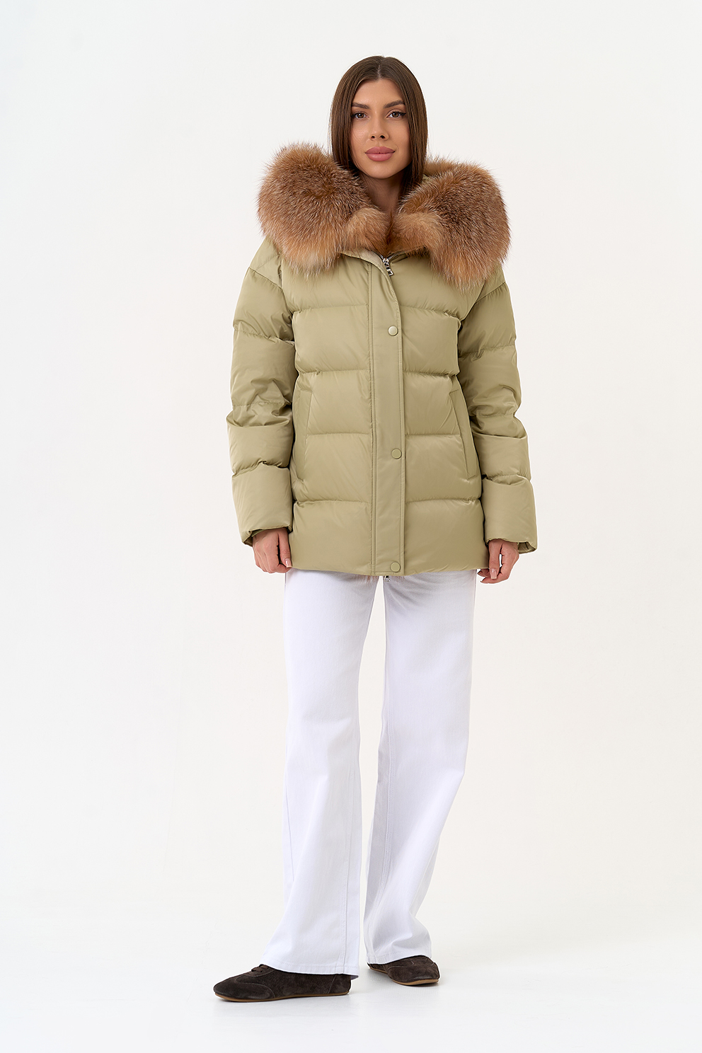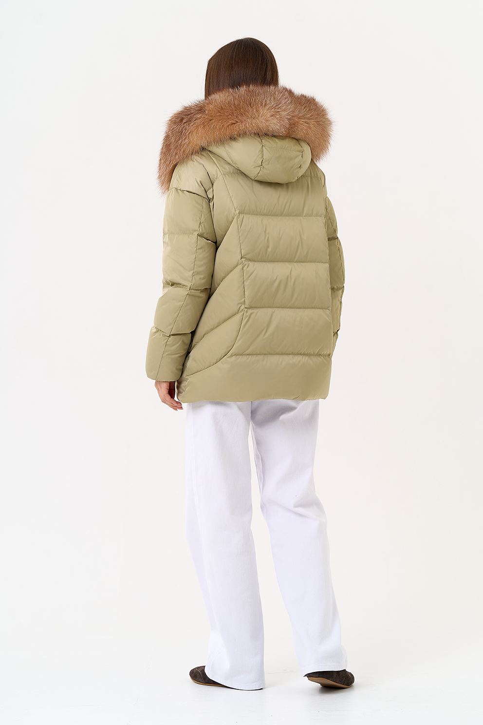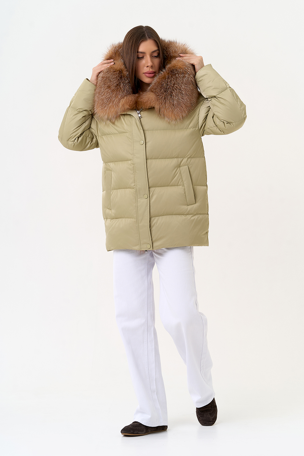 Крой воротника - капюшон, отделка мех рыжей лисы