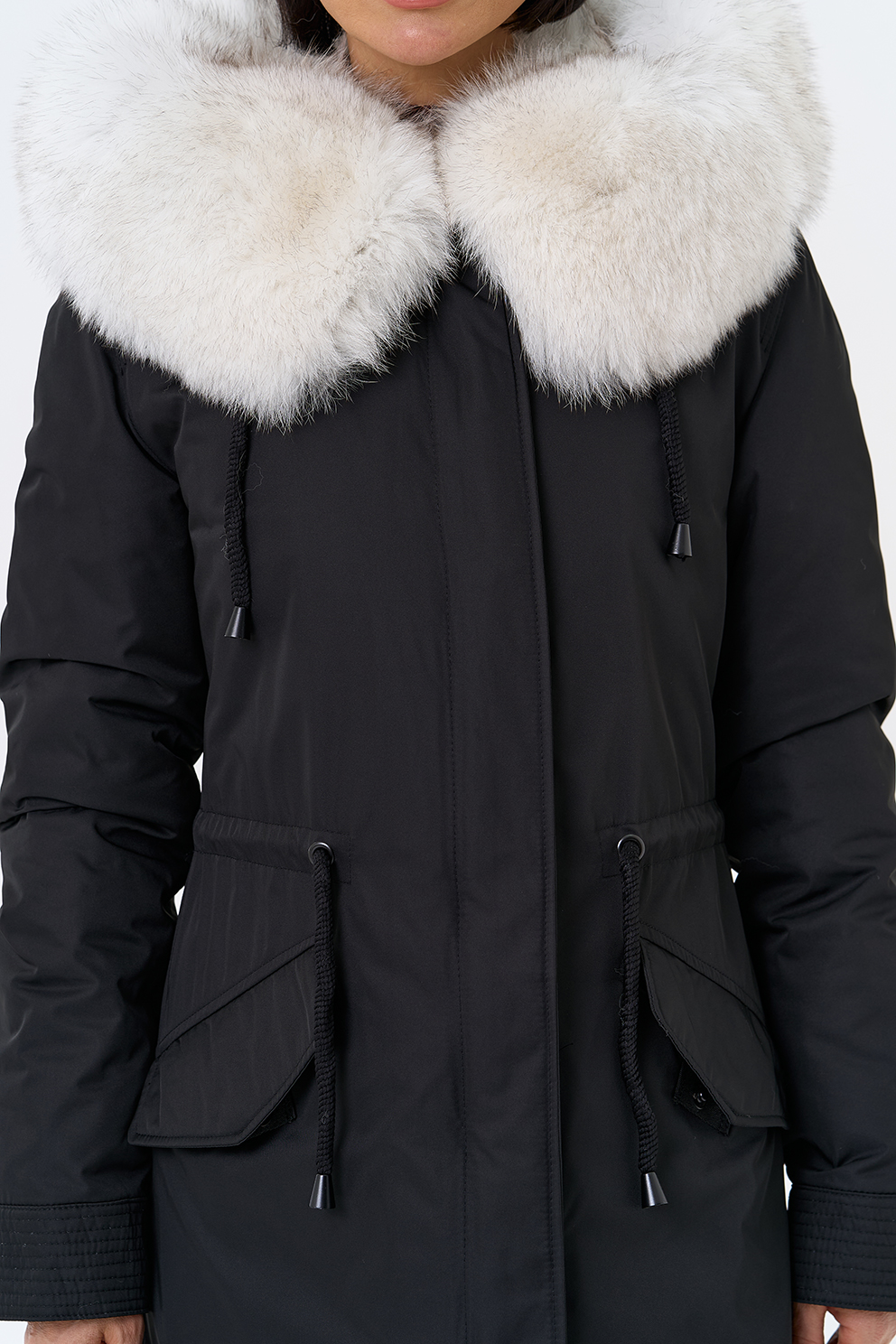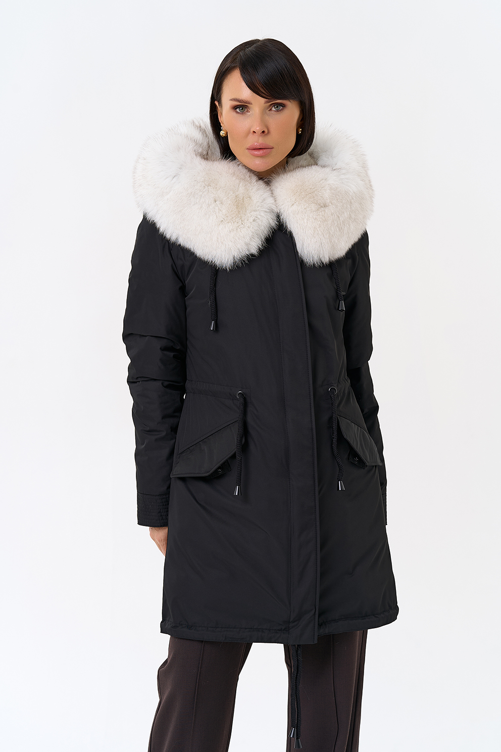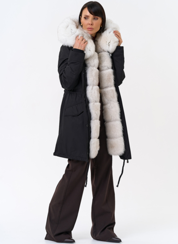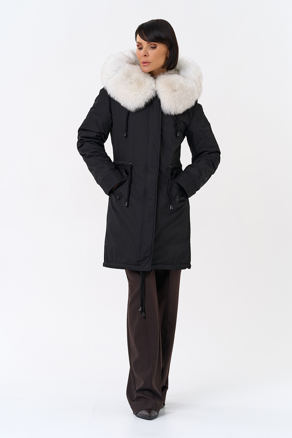 Крой воротника - капюшон, отделка песец цвет натуральный, овчина