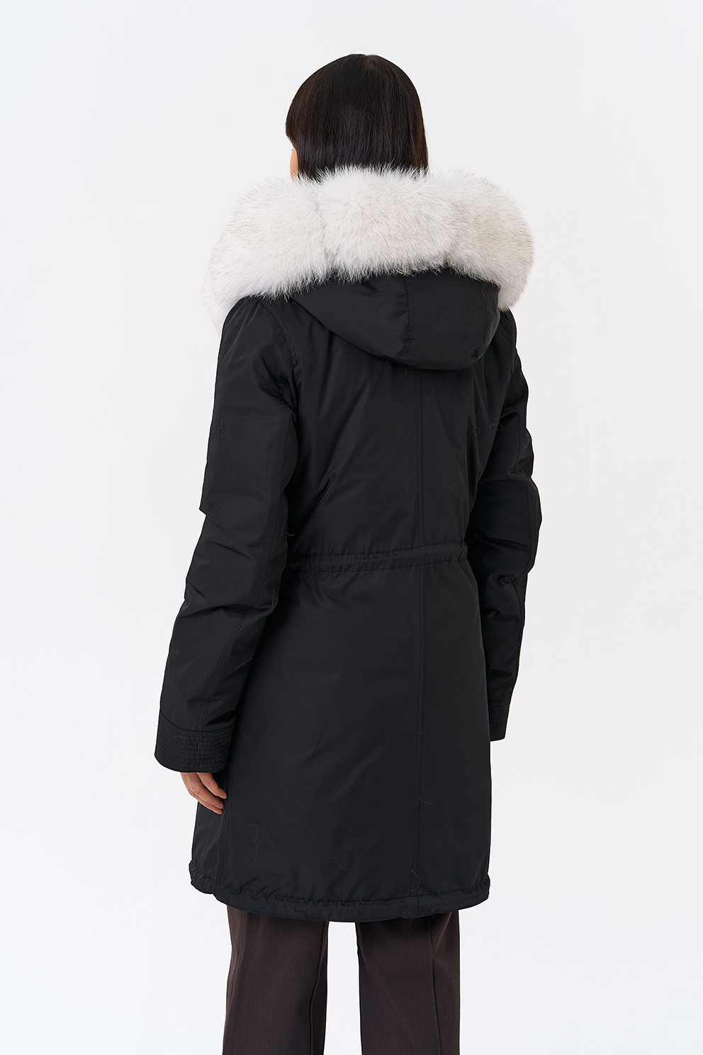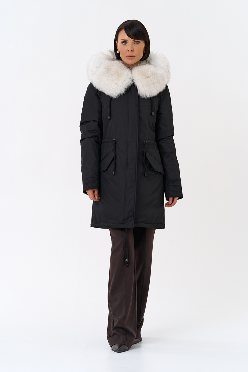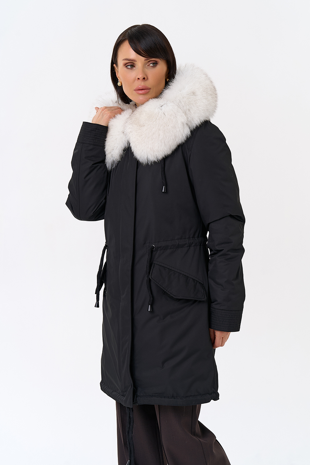 Крой воротника - капюшон, отделка песец цвет натуральный, овчина