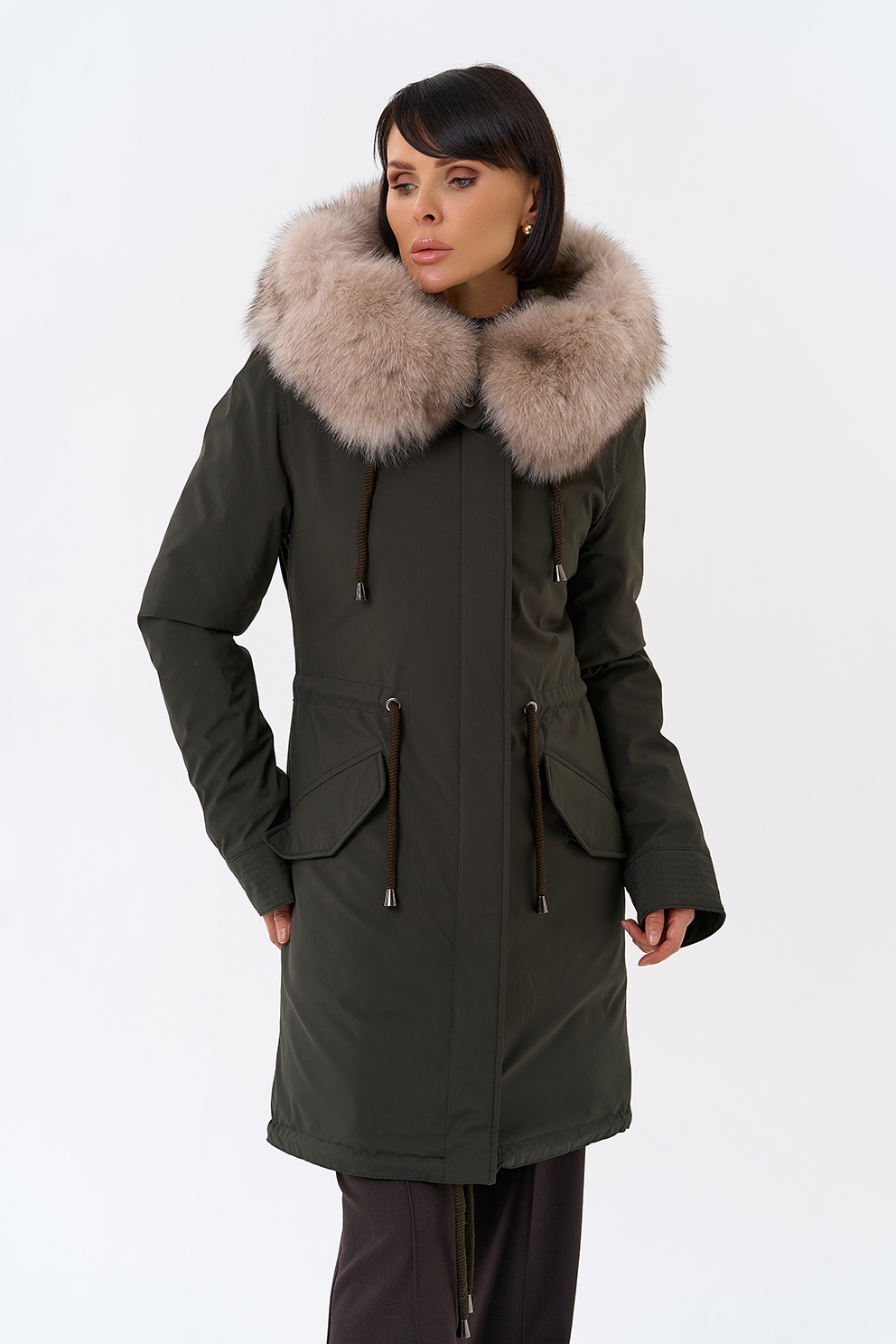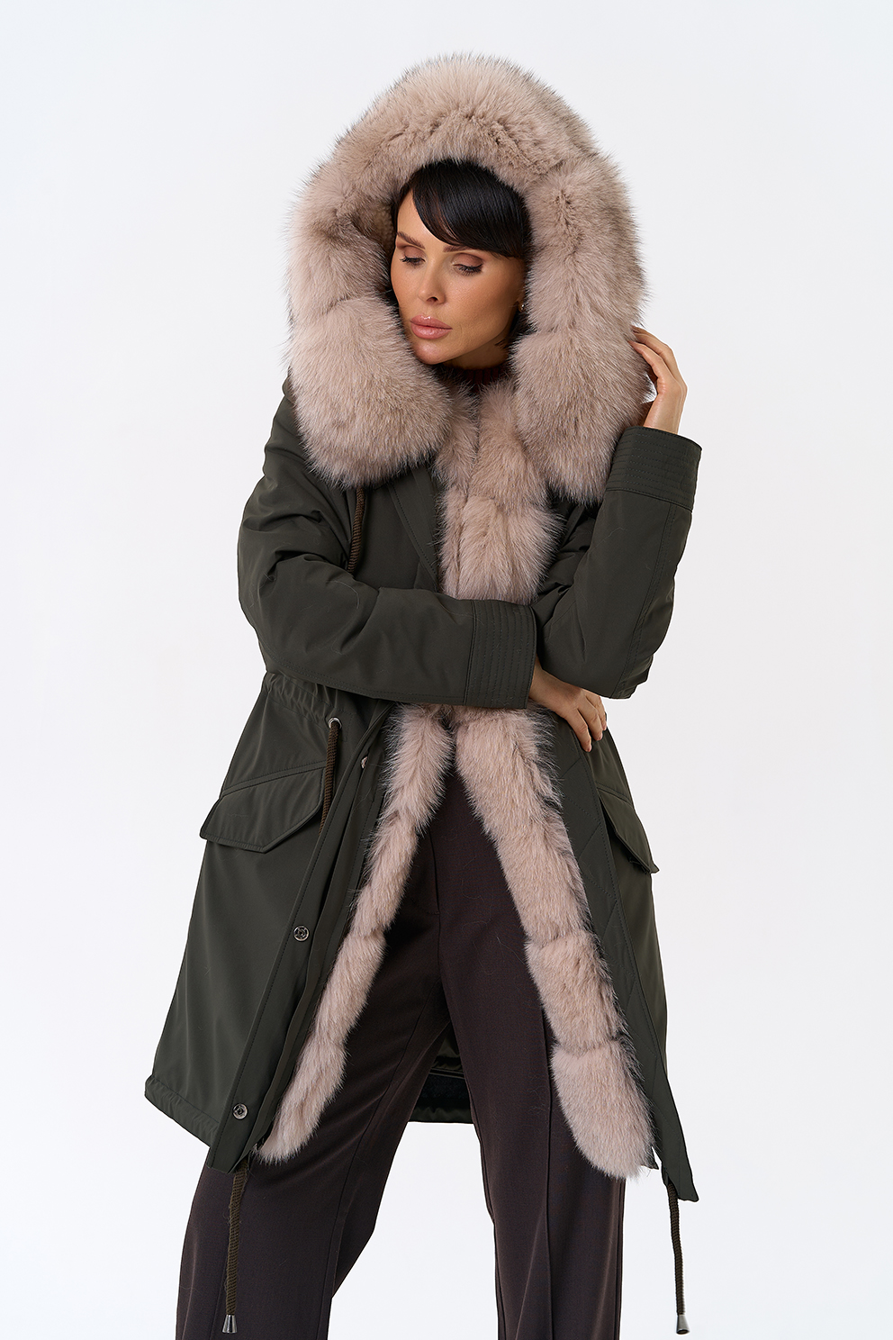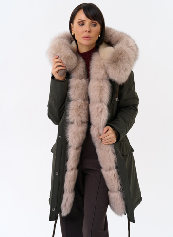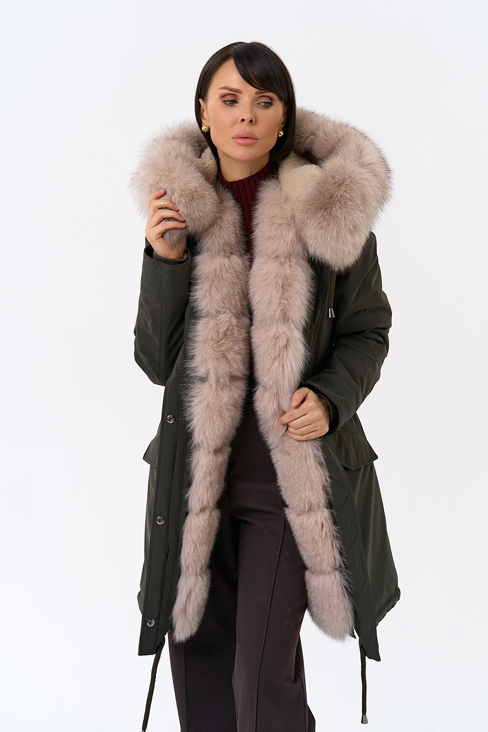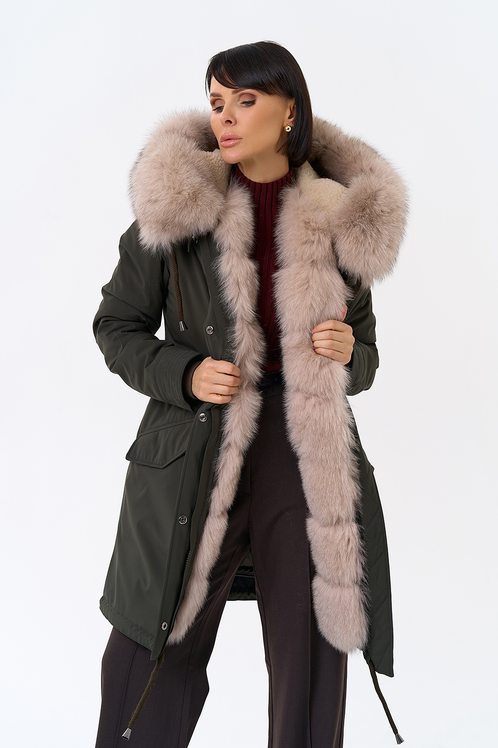 Крой воротника - капюшон, отделка песец цвет бежевый, овчина