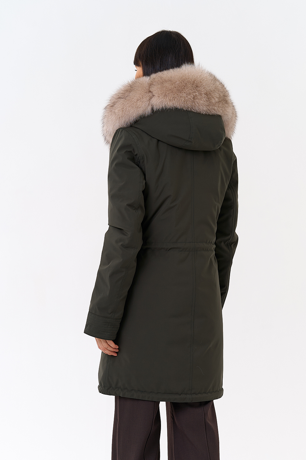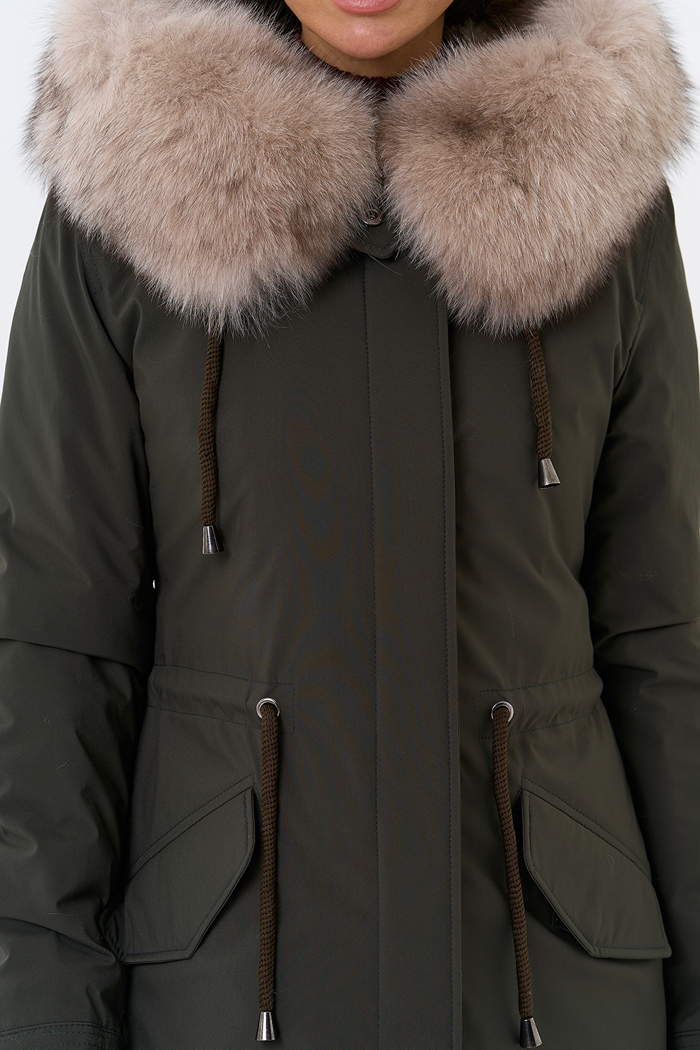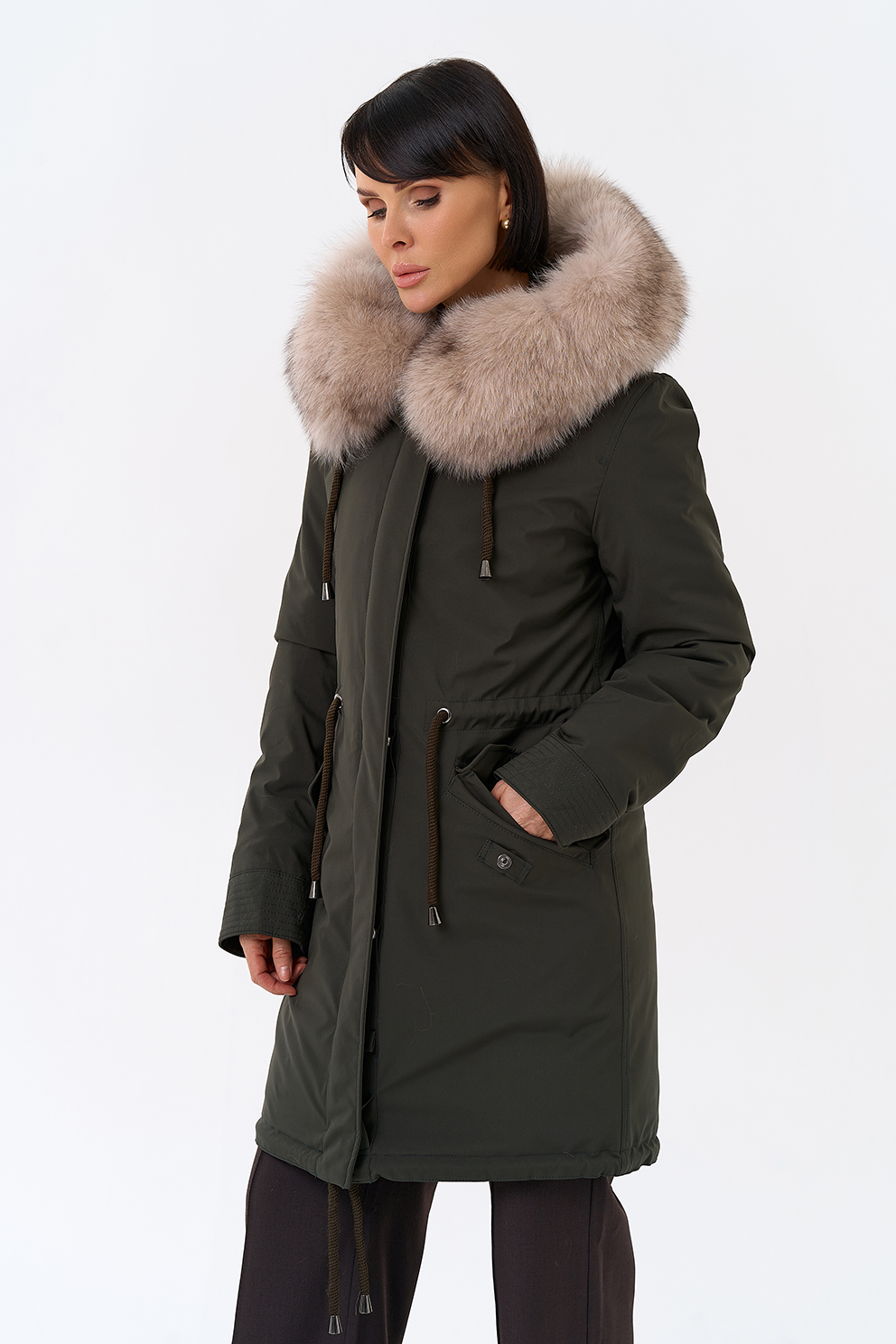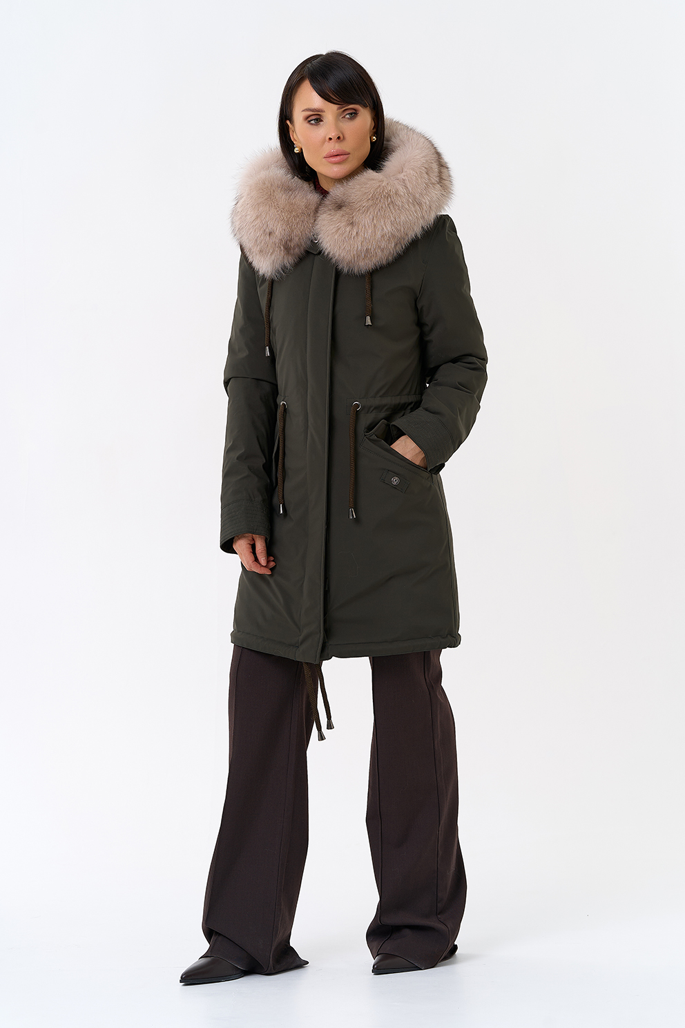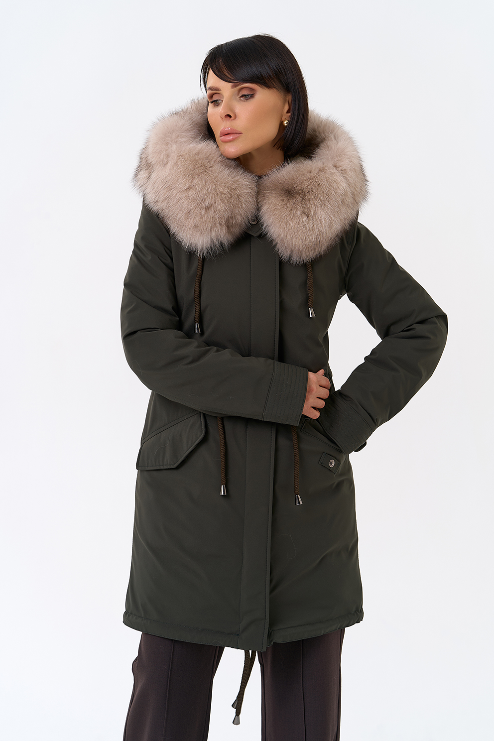 Крой воротника - капюшон, отделка песец цвет бежевый, овчина