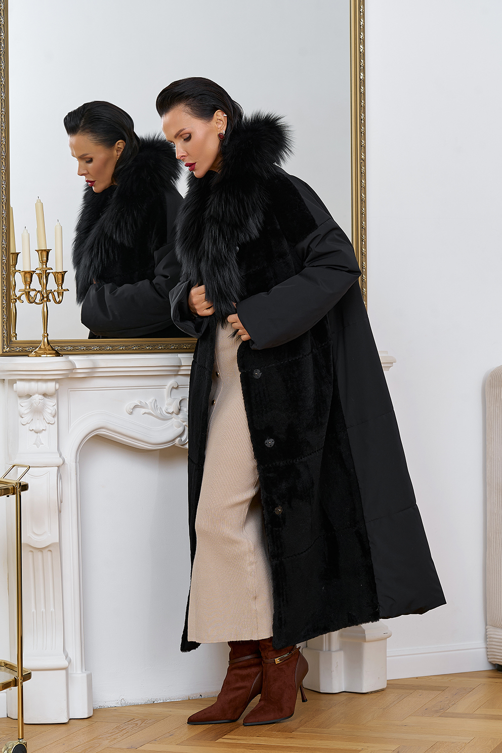 Вид застежки - кнопки, пояс из меха овчины