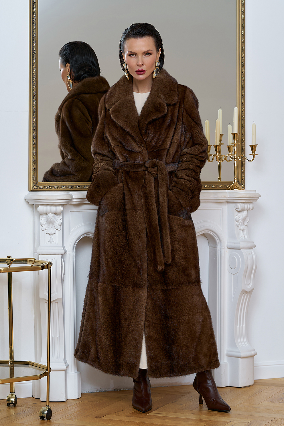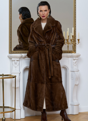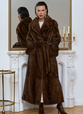 Шубу из меха скандинавской норки можно смело назвать произведением искусства. Раскладка меха крупными пластинами придает изделию особую изящность. Пояс позволит подчеркнуть талию и придать шубе утонченный силуэт. Длина изделия 130 см делает его универсальным и подходящим как для повседневного использования, так и для особых случаев.