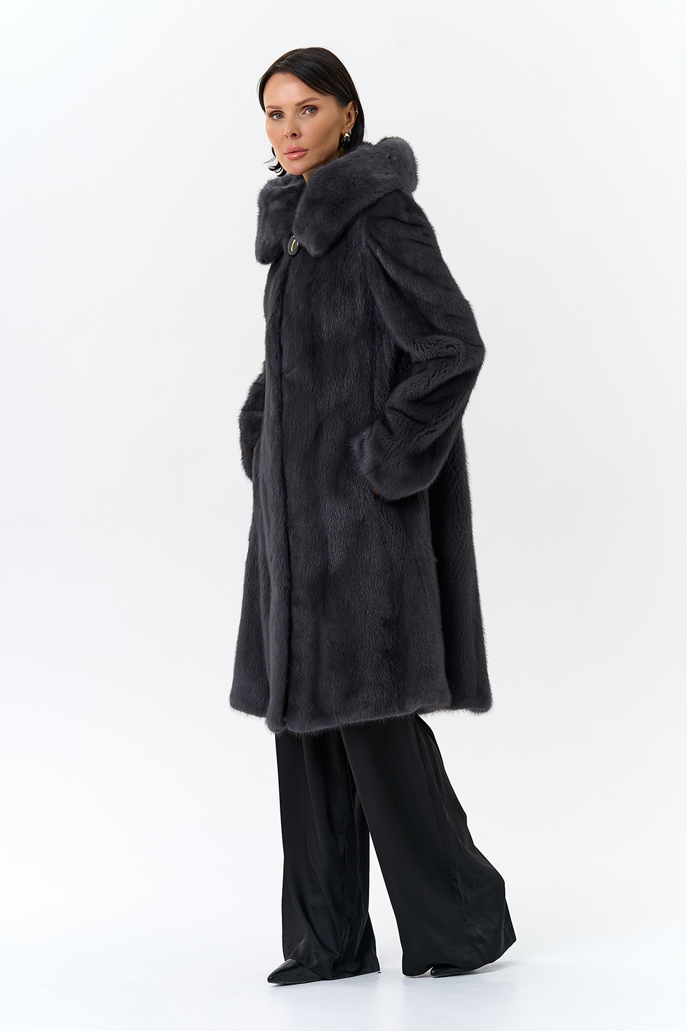 Норковая шуба годе/балетка в роспуск с капюшоном в роскошном цвете графит - это то изделие, в котором и девушка, и более взрослая леди почувствует себя особенно привлекательной. Этот фасон универсален, потому что позволяет экспериментировать с образами благодаря обуви и аксессуарам. Изделие дополнено пуговицами и шубными крючками. Представлен большой размерный ряд от 40 до 52 размера.